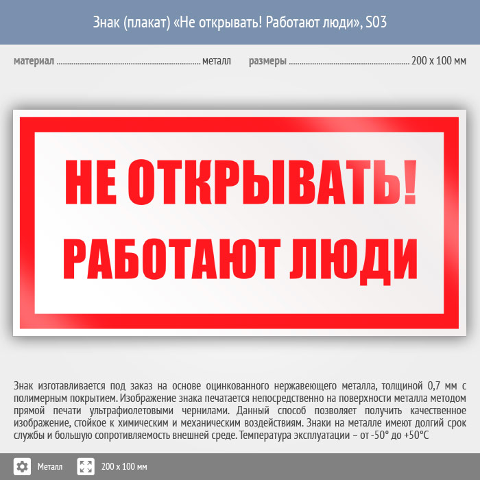 Знак (плакат) «Не открывать! Работают люди», S03 (металл, 200х100 мм) в Ижевске купить