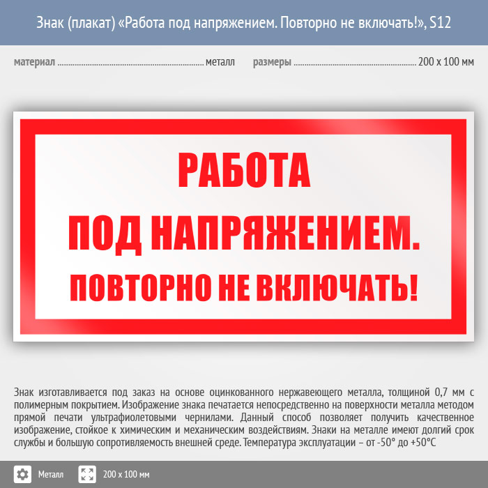 Знак (плакат) «Работа под напряжением. Повторно не включать!», S12 (металл, 200х100 мм) в Ижевске купить