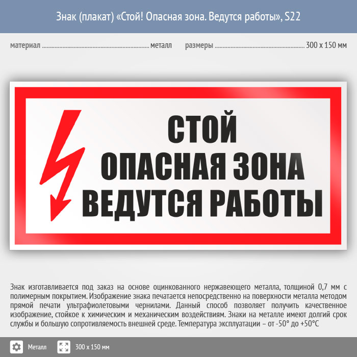 Знак (плакат) «Стой! Опасная зона. Ведутся работы», S22 (металл, 300х150 мм) в Ижевске купить