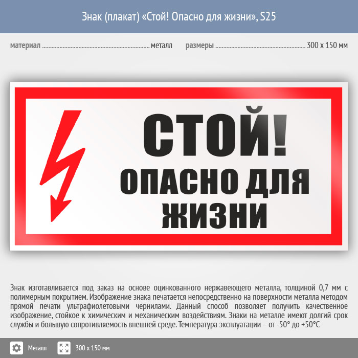 Знак (плакат) «Стой! Опасно для жизни», S25 (металл, 300х150 мм) в Ижевске купить