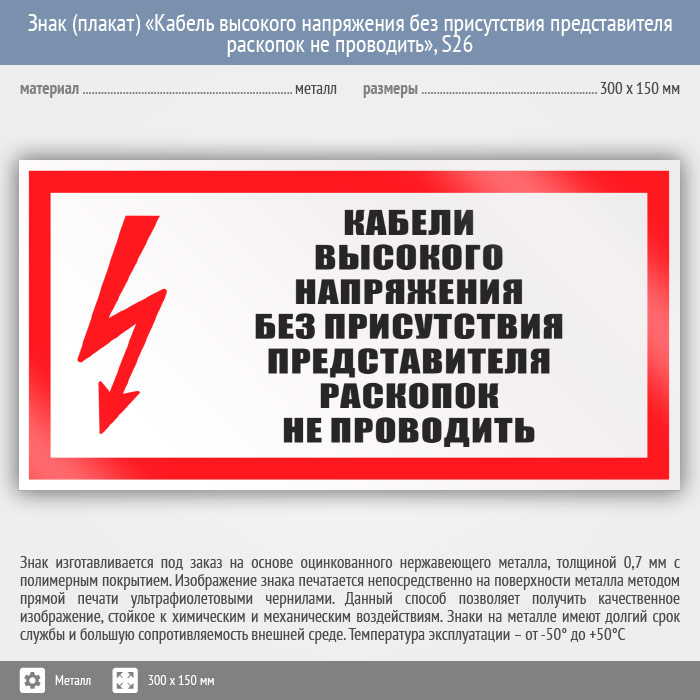 Знак (плакат) «Кабель высокого напряжения без присутствия представителя раскопок не проводить», S26 (металл, 300х150 мм) в Ижевске купить