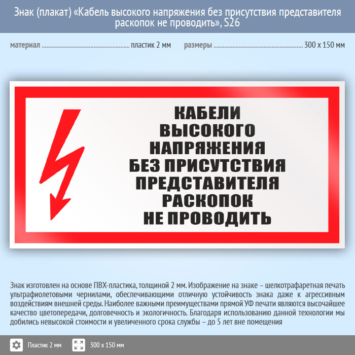 Знак (плакат) «Кабель высокого напряжения без присутствия представителя раскопок не проводить», S26 (пластик, 300х150 мм) в Ижевске купить