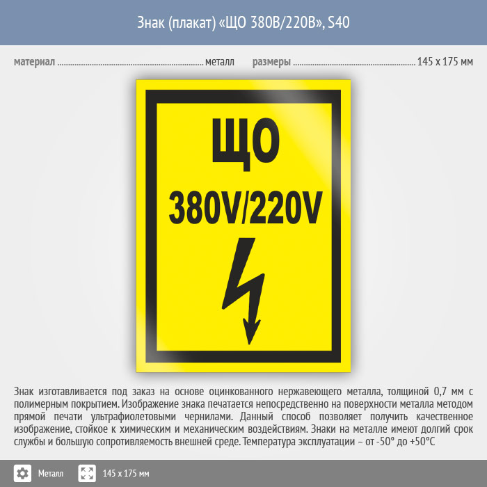 Знак (плакат) «ЩО 380В/220В», S40 (металл, 145х175 мм) в Ижевске купить