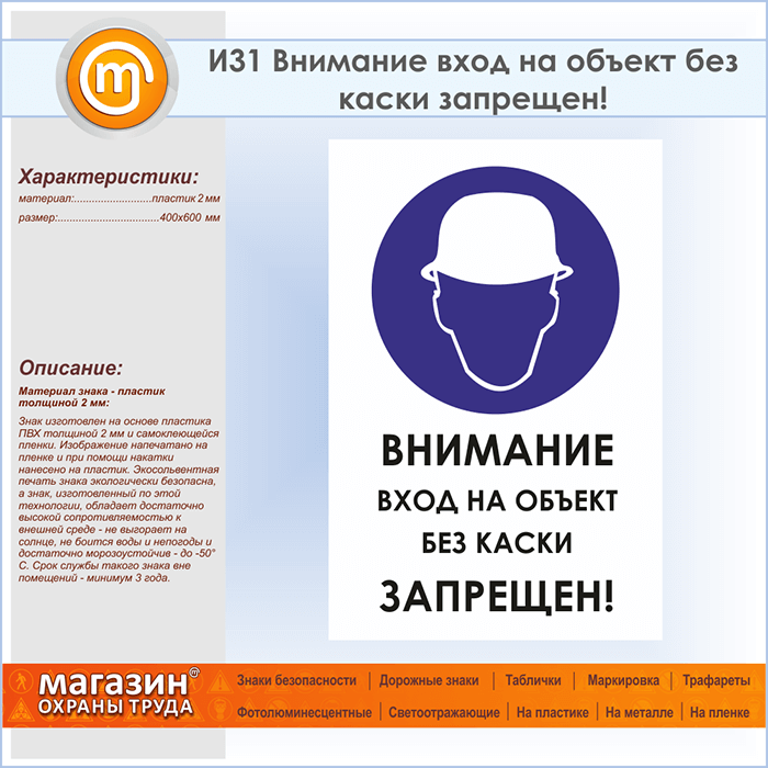 Знак «Внимание вход на объект без каски запрещен!», И31 (пластик, 400х600 мм) в Ижевске купить