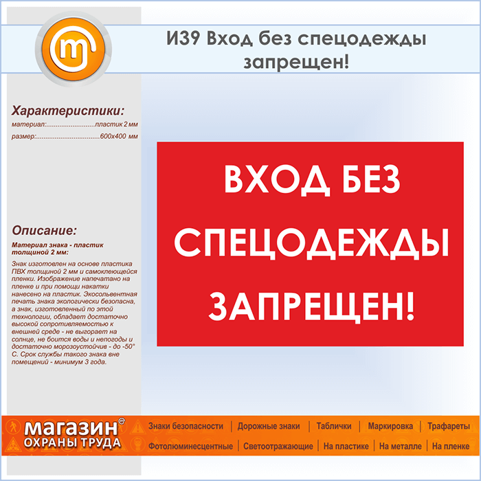 Знак «Вход без спецодежды запрещен!», И39 (пластик, 600х400 мм) в Ижевске купить