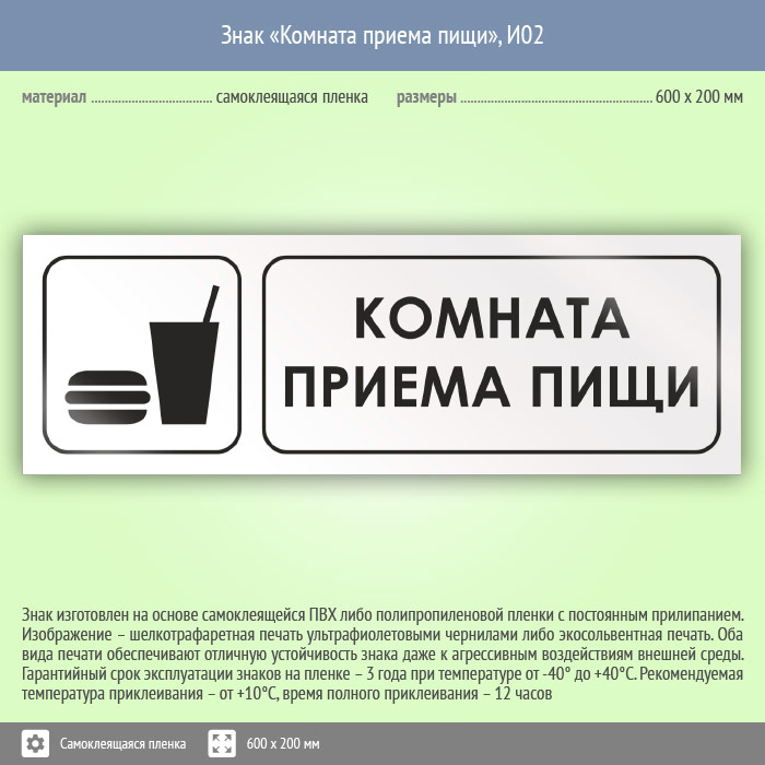Знак «Комната приема пищи», И02 (пленка, 600х200 мм) в Ижевске купить