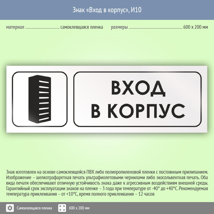 Знак «Вход в корпус», И10 (пленка, 600х200 мм) в Ижевске купить