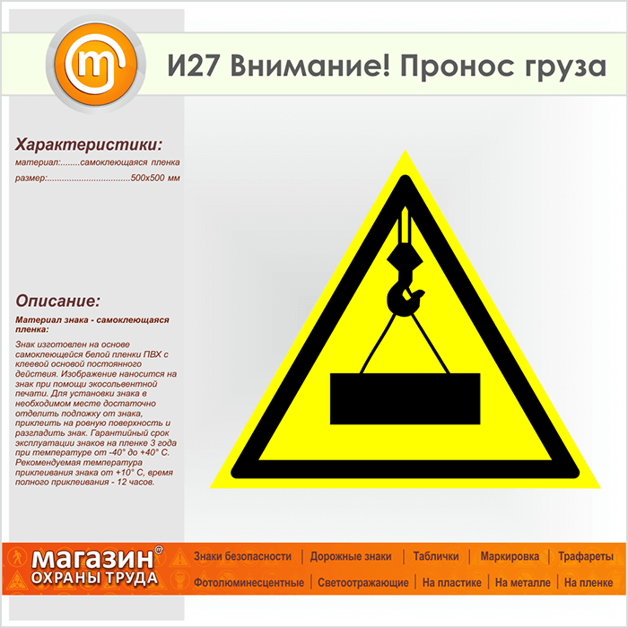Знак «Внимание! Пронос груза», И27 (пленка, сторона 500 мм) в Ижевске купить