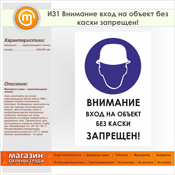 Знак «Внимание вход на объект без каски запрещен!», И31 (пленка, 600х900 мм) в Ижевске купить
