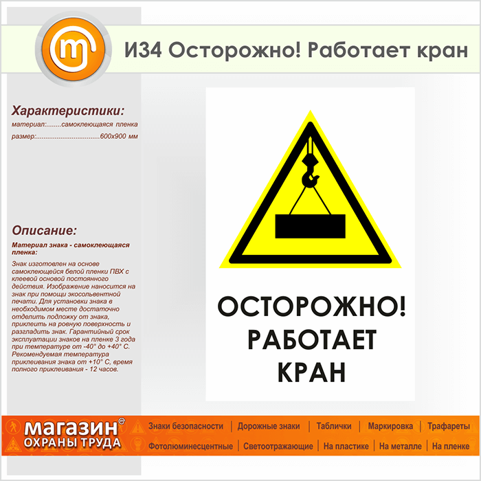 Знак «Осторожно! Работает кран», И34 (пленка, 600х900 мм) в Ижевске купить
