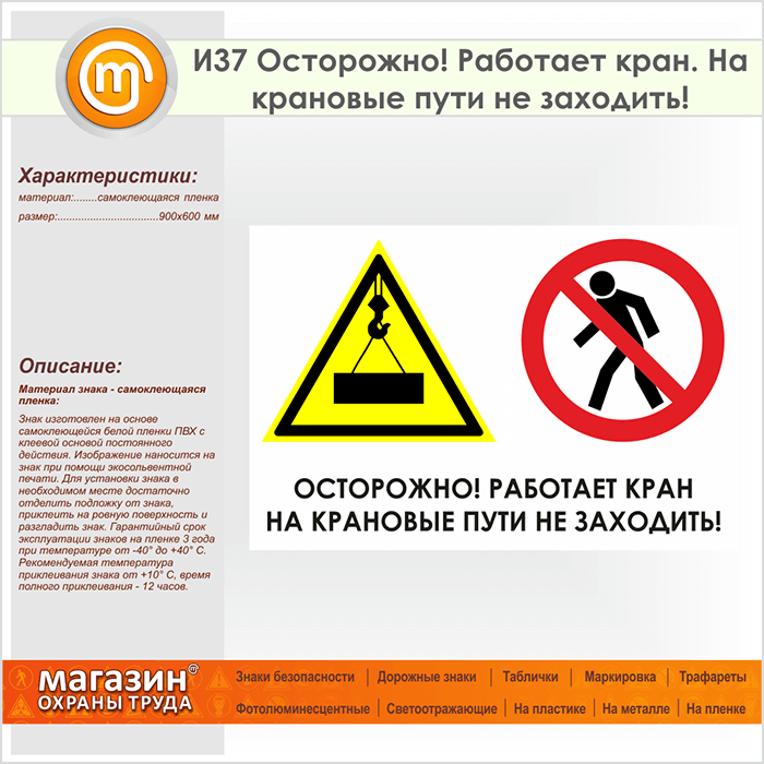 Знак «Осторожно! Работает кран. На крановые пути не заходить!», И37 (пленка, 900х600 мм) в Ижевске купить