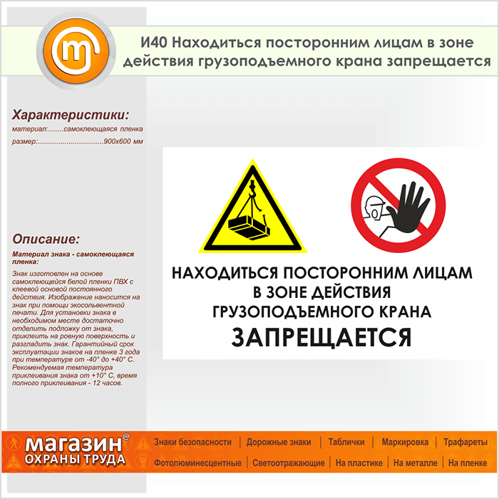 Знак «Находиться посторонним лицам в зоне действия грузоподъемного крана запрещается», И40 (пленка, 900х600 мм) в Ижевске купить
