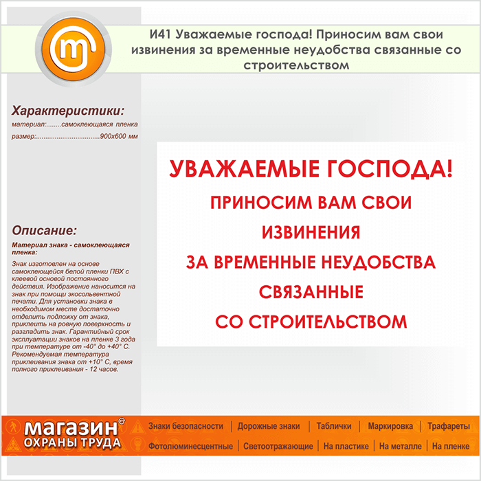 Знак «Уважаемые господа! Приносим вам свои извинения за временные неудобства, связанные со строительством», И41 (пленка, 900х600 мм) в Ижевске купить
