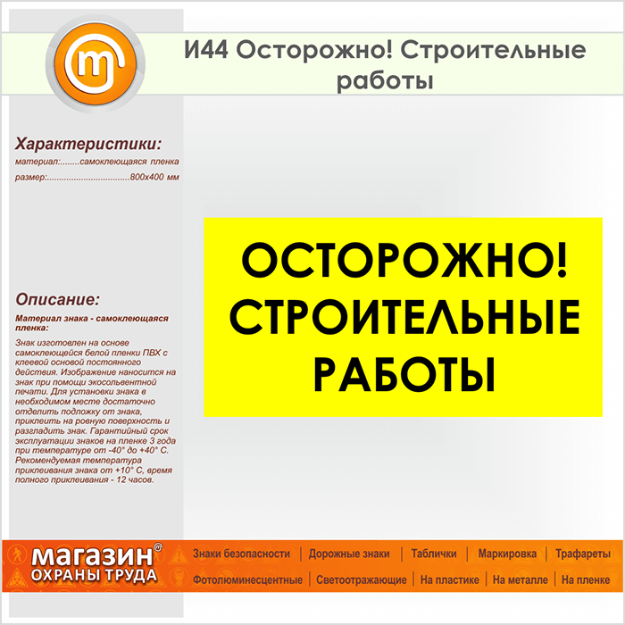 Знак «Осторожно! Строительные работы», И44 (пленка, 800х400 мм) в Ижевске купить