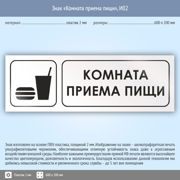 Знак «Комната приема пищи», И02 (пластик, 600х200 мм) в Ижевске купить