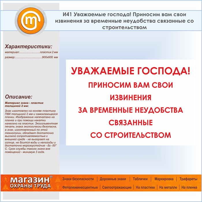 Знак «Уважаемые господа! Приносим вам свои извинения за временные неудобства, связанные со строительством», И41 (пластик, 900х600 мм) в Ижевске купить