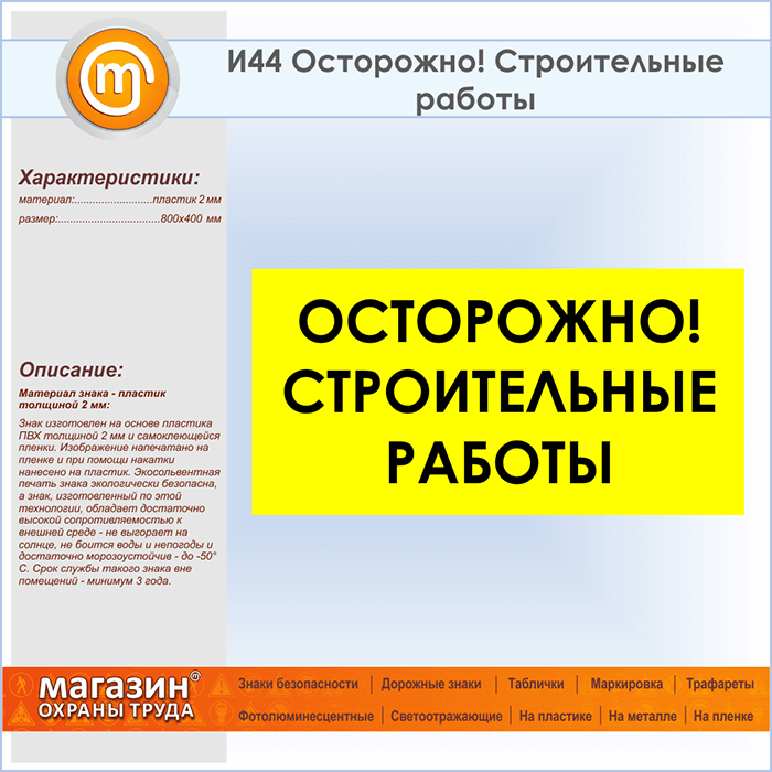 Знак «Осторожно! Строительные работы», И44 (пластик, 800х400 мм) в Ижевске купить