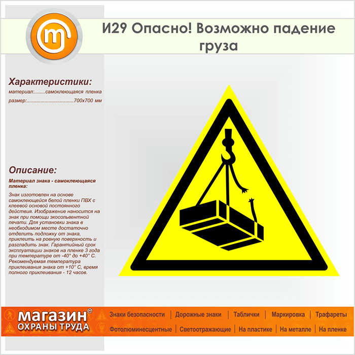 Знак «Опасно! Возможно падение груза», И29 (пленка, сторона 700 мм) в Ижевске купить