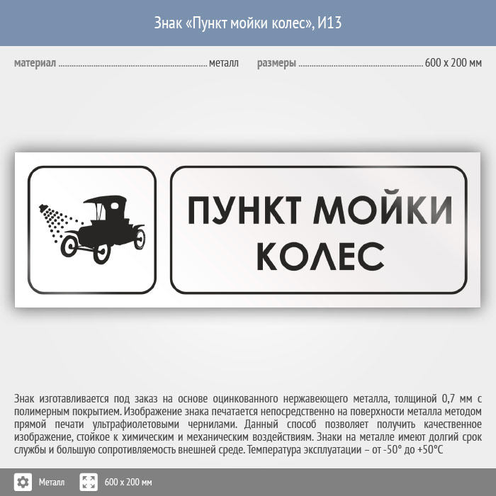 Знак «Пункт мойки колес», И13 (металл, 600х200 мм) в Ижевске купить