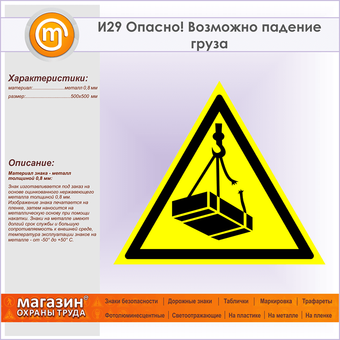 Знак «Опасно! Возможно падение груза», И29 (металл, сторона 500 мм) в Ижевске купить