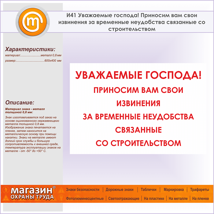 Знак «Уважаемые господа! Приносим вам свои извинения за временные неудобства, связанные со строительством», И41 (металл, 600х400 мм) в Ижевске купить