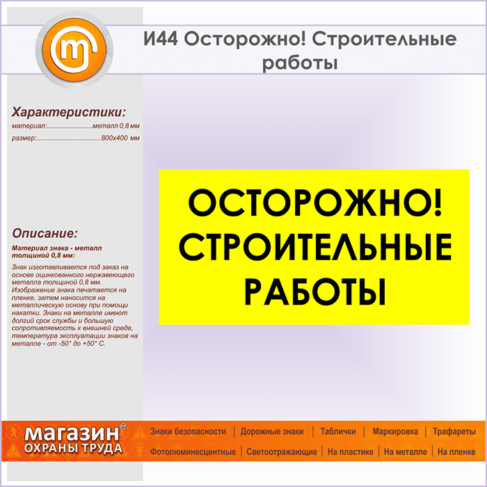 Знак «Осторожно! Строительные работы», И44 (металл, 800х400 мм) в Ижевске купить