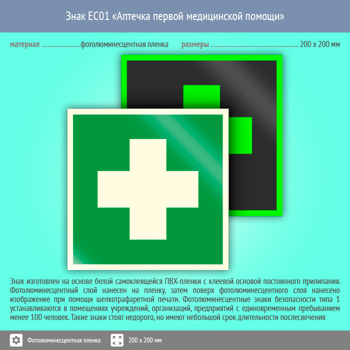 Знак EC01 «Аптечка первой медицинской помощи» (фотолюминесцентная пленка, 200х200 мм) в Ижевске купить