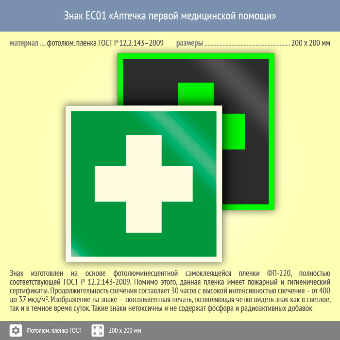 Знак EC01 «Аптечка первой медицинской помощи» (фотолюминесцентная пленка ГОСТ 34428-2018, 200х200 мм) в Ижевске купить