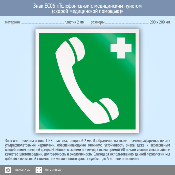 Знак EC06 «Телефон связи с медицинским пунктом (скорой медицинской помощью)» (пластик, 200х200 мм) в Ижевске купить
