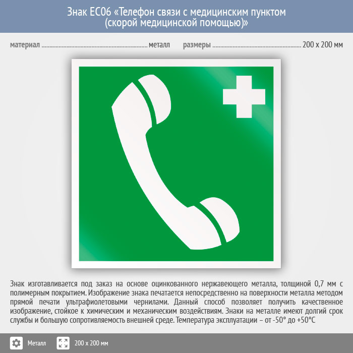 Знак EC06 «Телефон связи с медицинским пунктом (скорой медицинской помощью)» (металл, 200х200 мм) в Ижевске купить