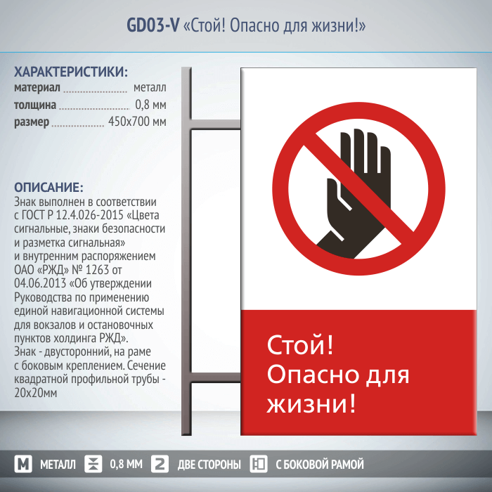 Знак «Стой! Опасно для жизни!», GD03-V (двусторонний вертикальный, 450х700 мм, металл, на раме с боковым креплением) в Ижевске купить