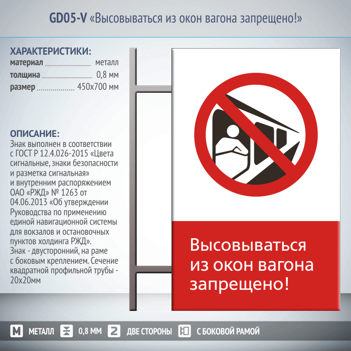 Знак «Высовываться из окон вагона запрещено!», GD05-V (двусторонний вертикальный, 450х700 мм, металл, на раме с боковым креплением) в Ижевске купить