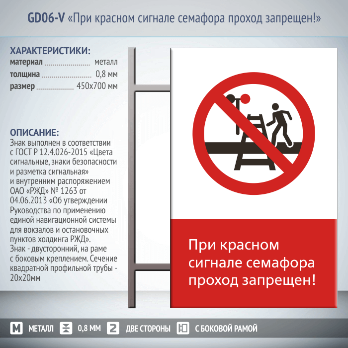 Знак «При красном сигнале семафора проход запрещен!», GD06-V (двусторонний вертикальный, 450х700 мм, металл, на раме с боковым креплением) в Ижевске купить