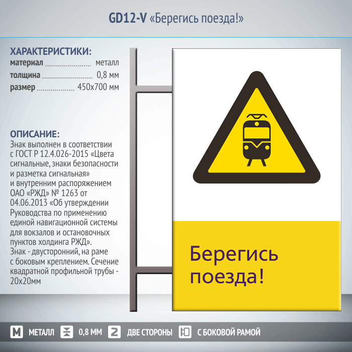 Знак «Берегись поезда!», GD12-V (двусторонний вертикальный, 450х700 мм, металл, на раме с боковым креплением) в Ижевске купить