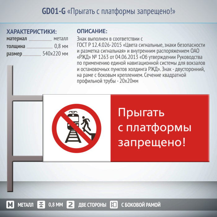 Знак «Прыгать с платформы запрещено!», GD01-G (двусторонний горизонтальный, 540х220 мм, металл, на раме с боковым креплением) в Ижевске купить
