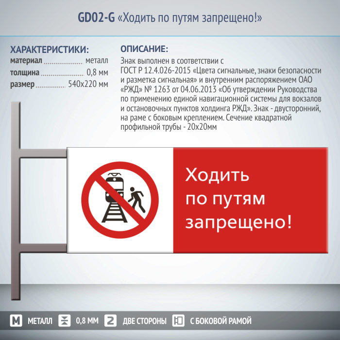 Знак «Ходить по путям запрещено!», GD02-G (двусторонний горизонтальный, 540х220 мм, металл, на раме с боковым креплением) в Ижевске купить