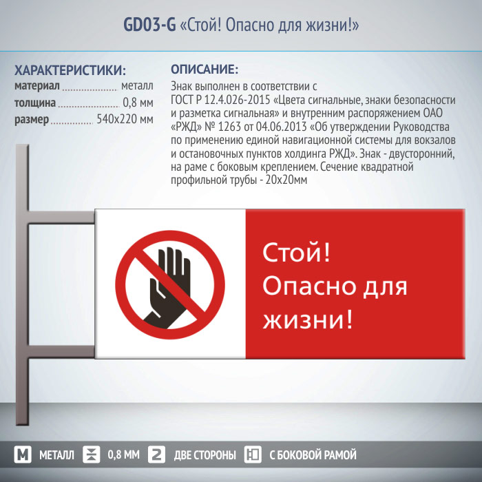 Знак «Стой! Опасно для жизни!», GD03-G (двусторонний горизонтальный, 540х220 мм, металл, на раме с боковым креплением) в Ижевске купить