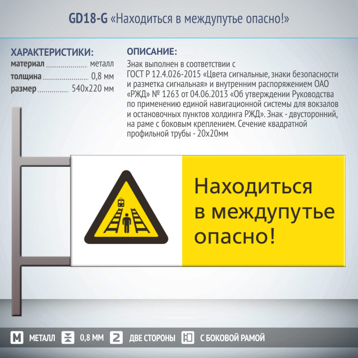 Знак «Находиться в междупутье опасно!», GD18-G (двусторонний горизонтальный, 540х220 мм, металл, на раме с боковым креплением) в Ижевске купить