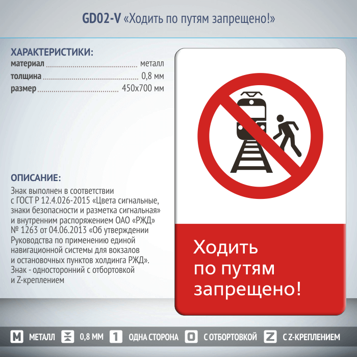 Знак «Ходить по путям запрещено!», GD02-V (односторонний вертикальный, 450х700 мм, металл, с отбортовкой и Z-креплением) в Ижевске купить