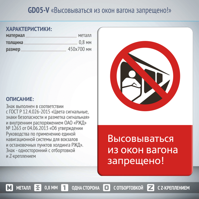 Знак «Высовываться из окон вагона запрещено!», GD05-V (односторонний вертикальный, 450х700 мм, металл, с отбортовкой и Z-креплением) в Ижевске купить