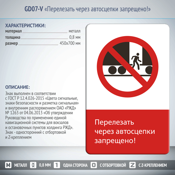 Знак «Перелезать через автосцепки запрещено!», GD07-V (односторонний вертикальный, 450х700 мм, металл, с отбортовкой и Z-креплением) в Ижевске купить