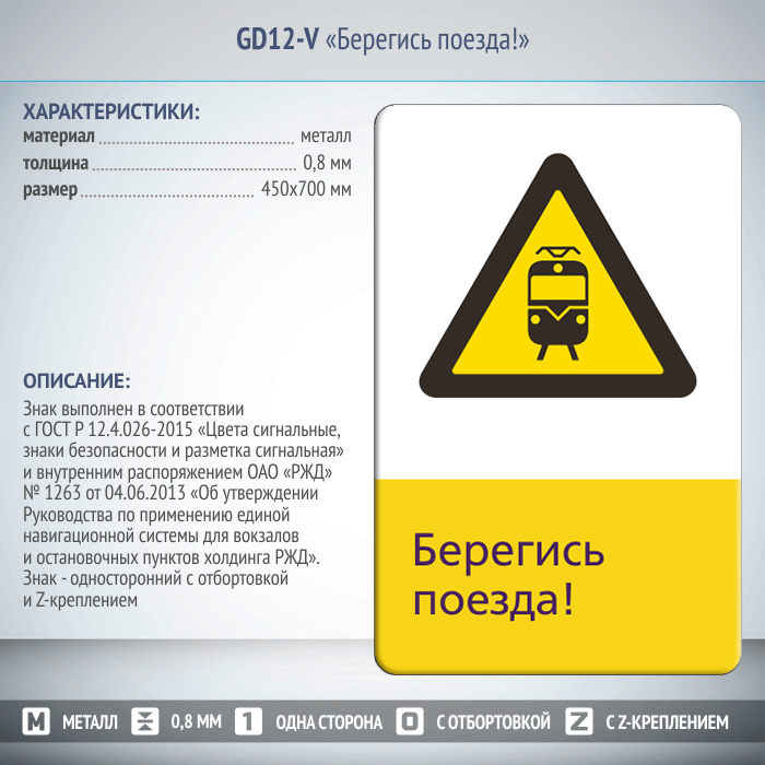 Знак «Берегись поезда!», GD12-V (односторонний вертикальный, 450х700 мм, металл, с отбортовкой и Z-креплением) в Ижевске купить