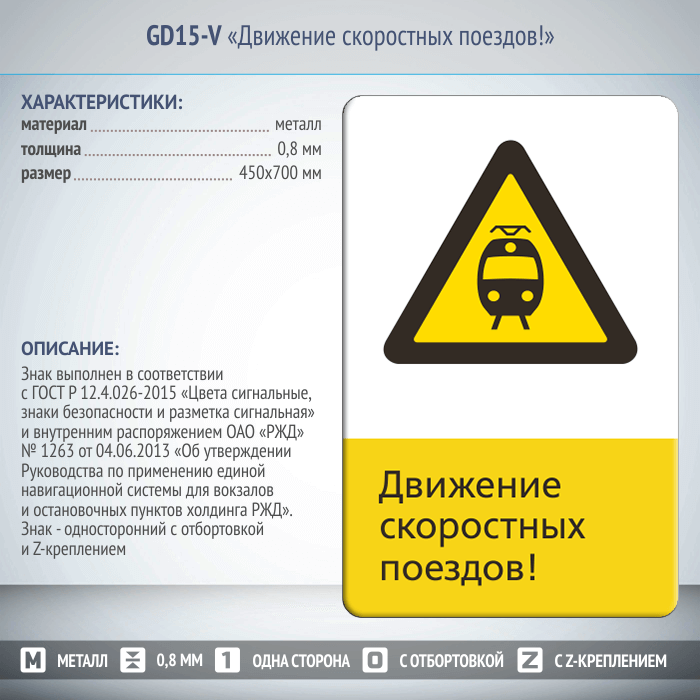 Знак «Движение скоростных поездов!», GD15-V (односторонний вертикальный, 450х700 мм, металл, с отбортовкой и Z-креплением) в Ижевске купить
