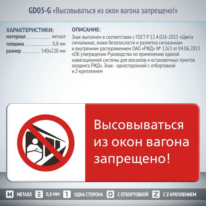Знак «Высовываться из окон вагона запрещено!», GD05-G (односторонний горизонтальный, 540х220 мм, металл, с отбортовкой и Z-креплением) в Ижевске купить