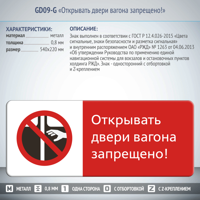 Знак «Открывать двери вагона запрещено!», GD09-G (односторонний горизонтальный, 540х220 мм, металл, с отбортовкой и Z-креплением) в Ижевске купить
