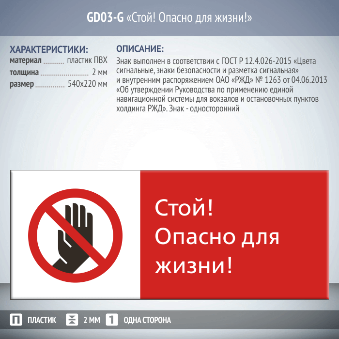 Знак «Стой! Опасно для жизни!», GD03-G (односторонний горизонтальный, 540х220 мм, пластик 2 мм) в Ижевске купить