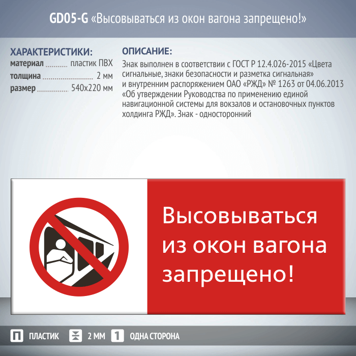 Знак «Высовываться из окон вагона запрещено!», GD05-G (односторонний горизонтальный, 540х220 мм, пластик 2 мм) в Ижевске купить