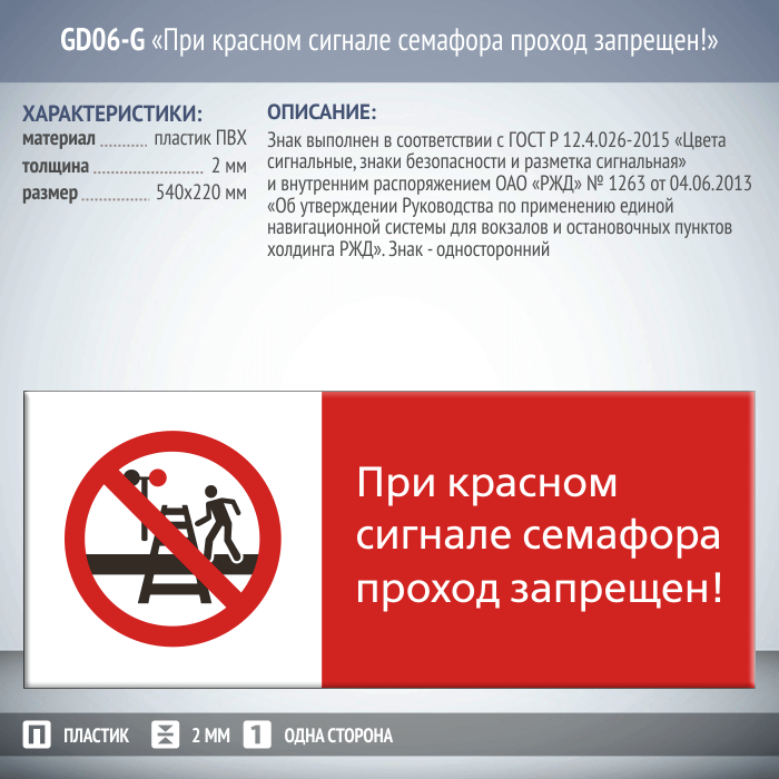 Знак «При красном сигнале семафора проход запрещен!», GD06-G (односторонний горизонтальный, 540х220 мм, пластик 2 мм) в Ижевске купить