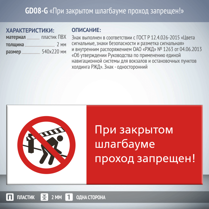 Знак «При закрытом шлагбауме проход запрещен!», GD08-G (односторонний горизонтальный, 540х220 мм, пластик 2 мм) в Ижевске купить