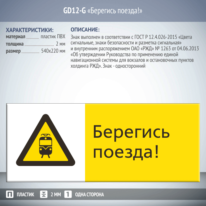 Знак «Берегись поезда!», GD12-G (односторонний горизонтальный, 540х220 мм, пластик 2 мм) в Ижевске купить